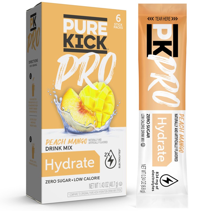 PURE KICK PRO Hydration Electrolyte Drink Mix, Peach Mango, Includes 1 Box with 6 Packets in Each Box