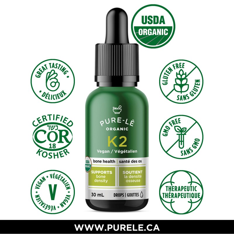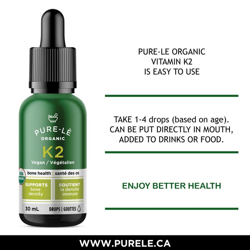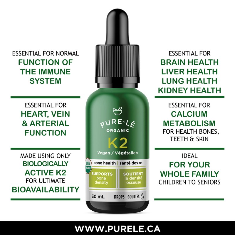 Pure-le Natural USDA Organic Vitamin K2 (MK-7) drops for your Whole Family - Completely bioavailable - Fast acting for all ages. Kosher, Vegan, Non-GMO. No Side Effects - Ultra Premium Dietary Supplement Made in Canada