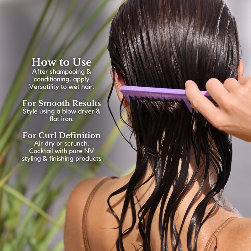 * Pure NV versatility is a multipurpose styling potion designed to smooth the hair, making it silky and shiny, control & tame your wild curls without the stiffness of a gel, and it can be used as a blowdry serum to speed up blow drying, repair damage caused by heat styling, and prevent further damage from thermal abuse!