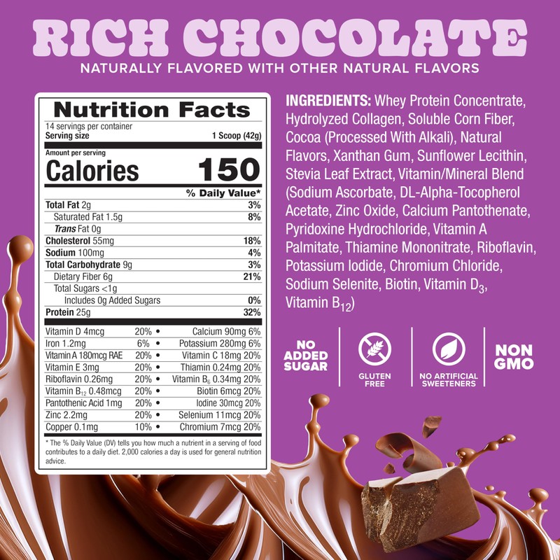 Pure Protein All-In-One Powder C Rich Chocolate Fuel your body with Pure Protein All-In-One Powder, a delicious and nutritious protein supplement designed to support muscle recovery, energy, and overall wellness. Packed with 20g of high-quality protein per serving, this formula combines whey and collagen protein to provide essential amino acids for lean muscle support. With no added sugar, high fiber, and essential vitamins & minerals, this protein powder is a clean and effective way to meet your daily nutritional needs. The rich chocolate flavor makes every sip smooth and satisfying, whether enjoyed as a post-workout shake, meal replacement, or on-the-go nutrition boost. Crafted with non-GMO, gluten-free ingredients, this formula supports digestion, vitality, and overall well-being without artificial additives. Whether you're an athlete, fitness enthusiast, or just looking for a wholesome protein source, Pure Protein All-In-One Powder is the perfect addition to your daily routine!