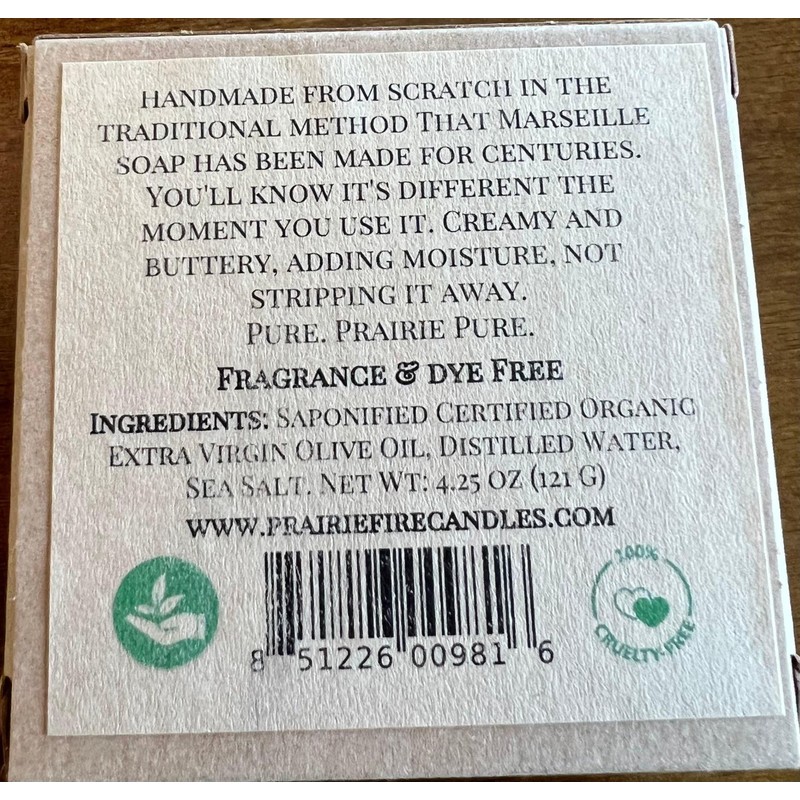 A 3 pack (3 bars of soap) of our Prairie Pure Real Castile, an organic vegan 100% olive oil soap made with only 100% certified organic extra virgin olive oil and distilled water. It produces a mild, buttery lather that helps your skin to retain your natural oils, not strip them away.