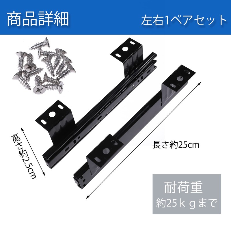 This product can be installed using the included L-angle on the back of the top board, and comes with the necessary screws for installation and is ready to install. The load capacity of this sliding rail is about 55.1 lbs (25 kg). Perfect for storing heavier items in a drawer.