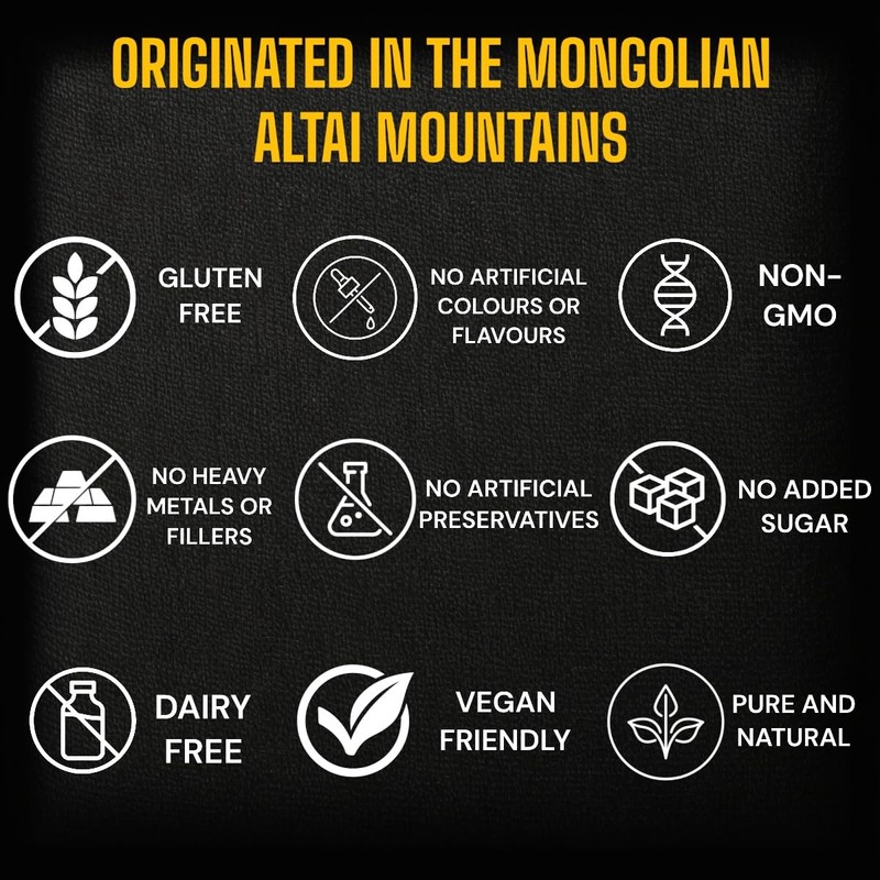 • ⛰️ Shilajit sourced directly from the Altai Mountain range. Altai Shilajit is typically known for its higher nutrient content compared to that of Himalayan origin. Get in touch to check out our lab reports! 💪 Shilajit naturally rich in minerals, vitamins and micronutrients. Full of fulvic acid and Humic compounds. Our Shilajit is heavy metal tested for peace of mind. 🔄 Easy to Use: Our Shilajit Resin is simple to incorporate into daily routine – dissolve a small amount in warm water or mix it into a beverage. Enjoy the benefits of this ancient superfood.