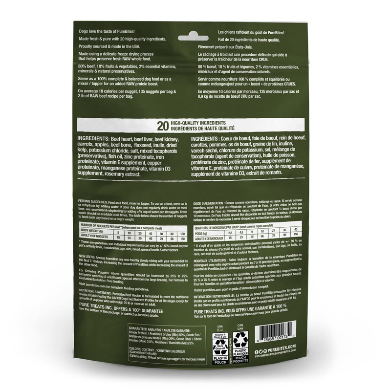 - Go ahead, look at our ingredients; made with only 20 simple human grade ingredients: 80% pure beef, 18% carrot & apple, and 2% essential vitamins, minerals, & natural preservatives. PureBites beef recipe is proudly sourced and freeze dried RAW in the USA and can be fed as a complete & balanced food, mixer, or topper for your dog