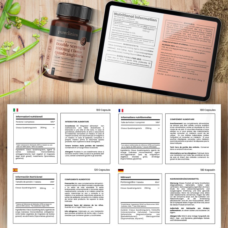 Pureclinica Double Strength Cissus Quadrangularis 1000mg x 180 Veggie Capsules -Up to 6 Months Supply