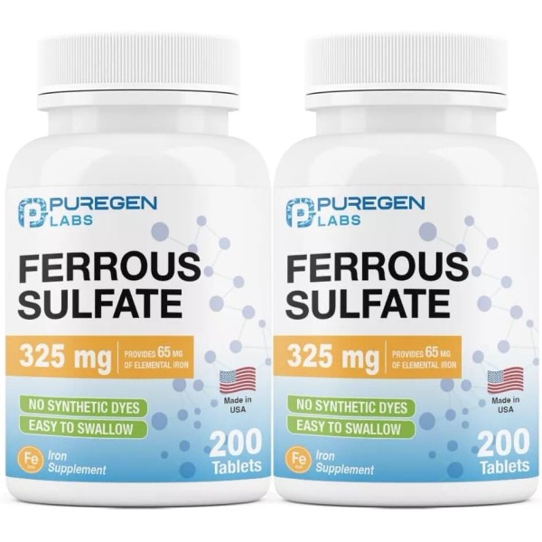 Puregen Labs Ferrous Sulfate 325 mg (65 mg Elemental Iron) High Potency Iron Supplement | No Artificial Color Additives - 200 Tablets