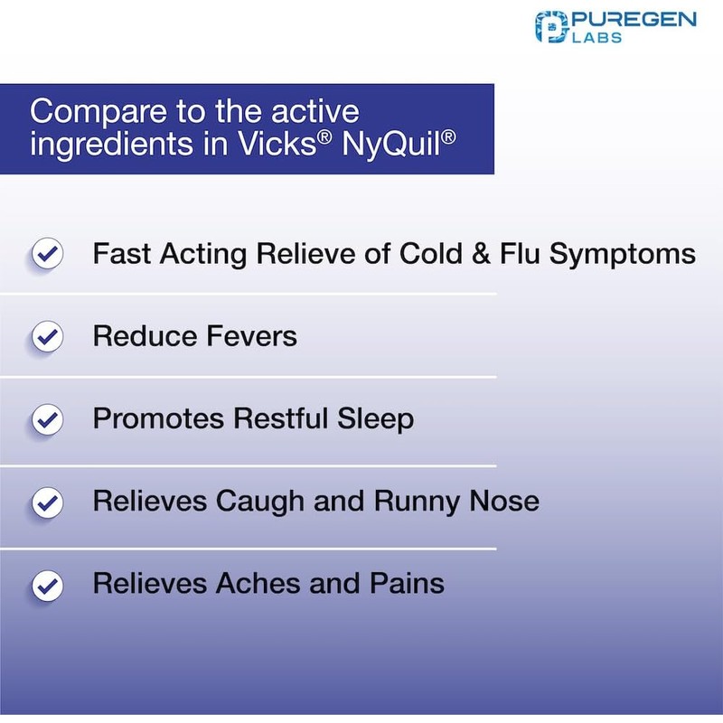 - ✅ Fast-Acting: Puregen Labs formula allows for quick and easy absorption, providing fast-acting relief when you need it most. Say goodbye to the discomfort of cold and flu symptoms and let your body recover during restful sleep.