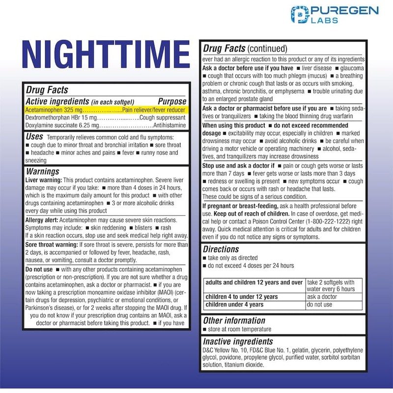 - ✅ Power of One: Puregen Labs NightTime relief single softgel liqui capsule contains pain reliever, fever reducer, cough suppressor and antihistamine to make sure nothing is bothering you during your sleep.