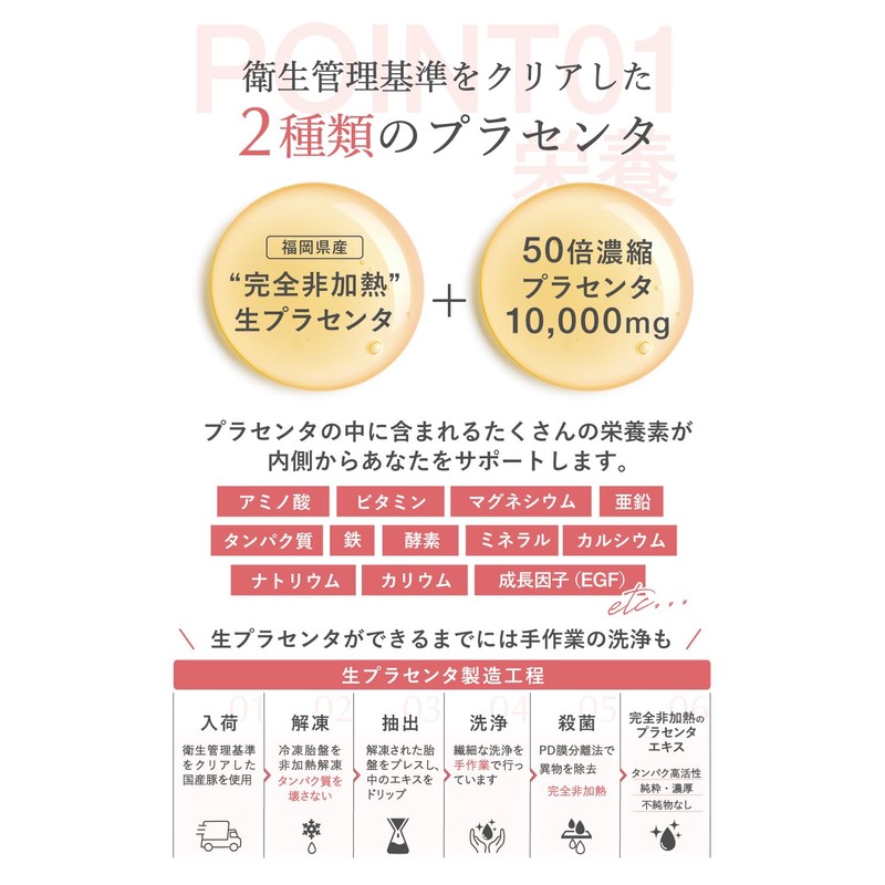 - Point 1・・・『感動の2大成分を贅沢配合』福岡県産の生プラセンタ(純粋・濃厚なプラセンタを使用。さらに発酵熟成した豚・馬プラセンタをプラスで配合。)、超低分子コラーゲン(低分子のコラーゲンペプチドを使用。分子が小さいから2.6倍の透過が速い。)を使用。