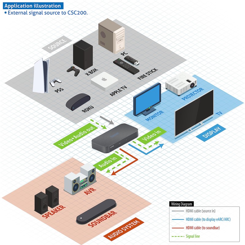 - Ideal for home theater applications with eARC-compatible soundbars and non-eARC compatible TVs: for example, simply connect your PS5 and eARC Dolby Atmos soundbar directly to the CSC200 for a comprehensive, high-quality 3D room sound experience while still being able to use your existing 4K TV!