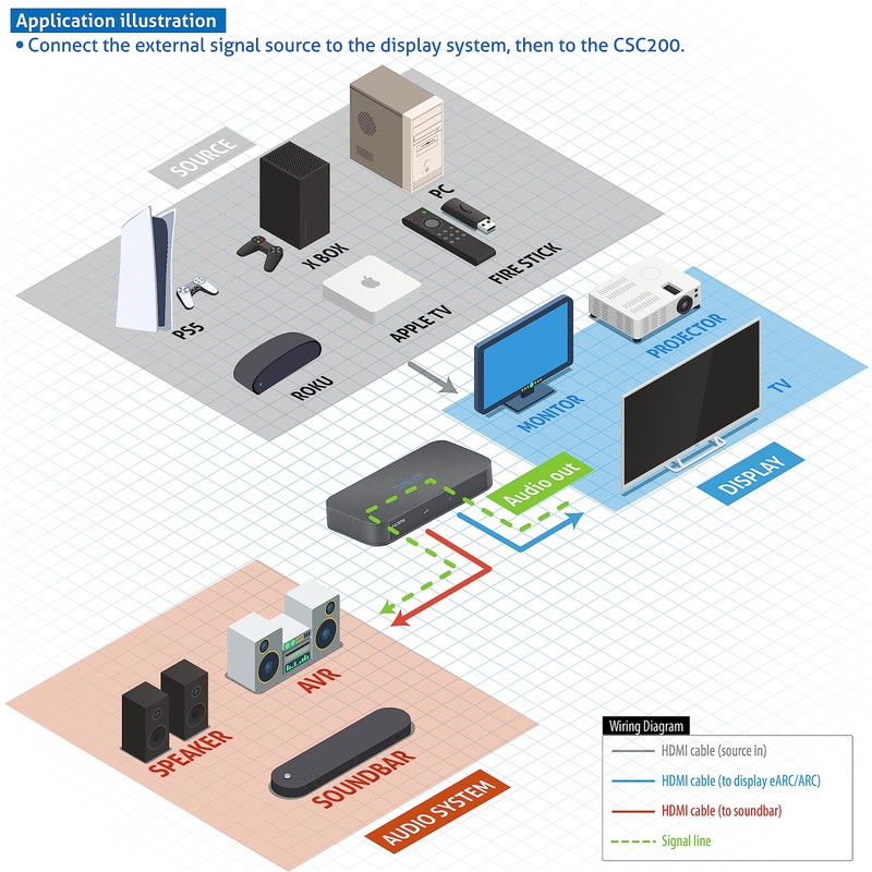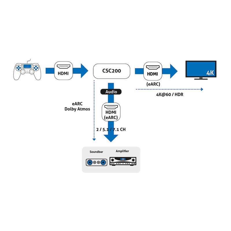 - Ideal for home theater applications with eARC-compatible soundbars and non-eARC compatible TVs: for example, simply connect your PS5 and eARC Dolby Atmos soundbar directly to the CSC200 for a comprehensive, high-quality 3D room sound experience while still being able to use your existing 4K TV!