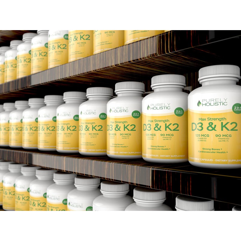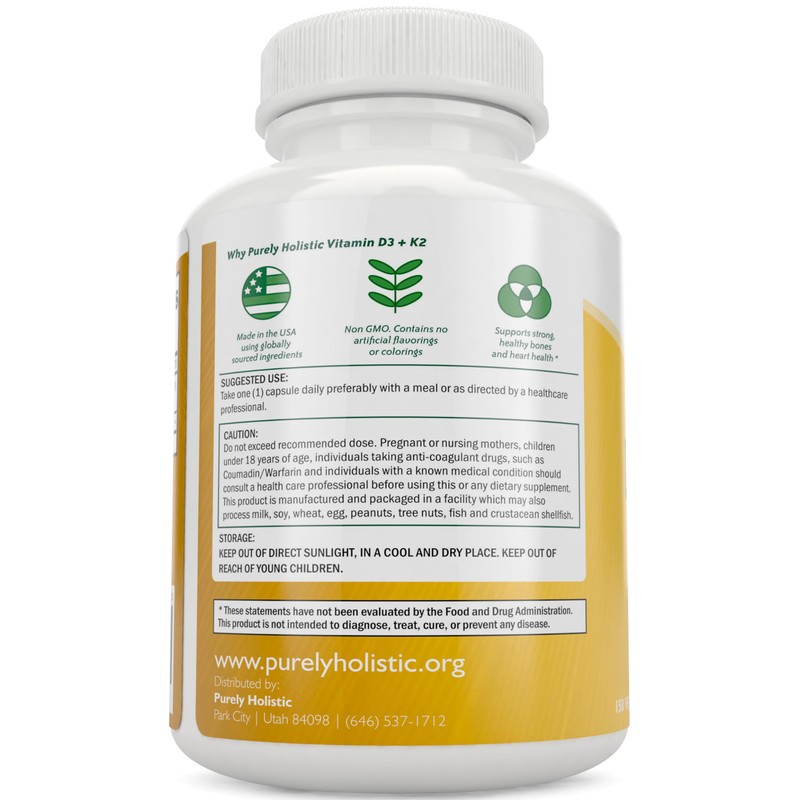 Purely Holistic Vitamin D3 125mcg and Vitamin K2 90mcg MK7-4 Month Supply 150 Vegetarian Capsules - Vitamin D3 & K2 Menaqunione - High Strength Cholecalciferol Made in The USA