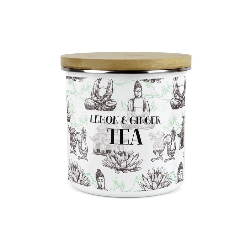 - This sturdy enamel lemon & ginger tea storage container is a stunning yet practical addition to any kitchen! Featuring an Asian-inspired print, with Buddhas, dragons, buildings & cherry blossom.