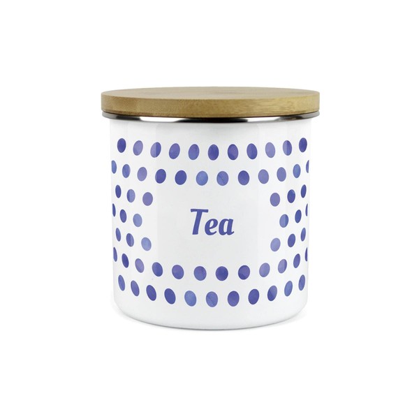- This sturdy enamel tea storage container is a stunning yet practical addition to any kitchen! Featuring an indigo spotty polka dot design!