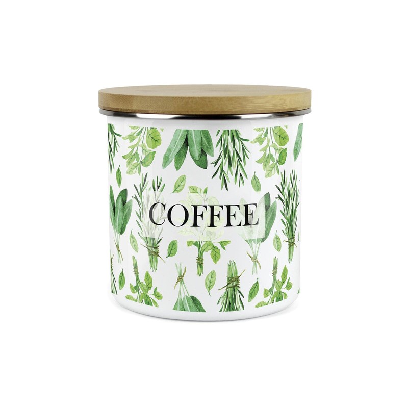 - This durable enamel coffee storage container is a stunning yet practical addition to any kitchen! With an intricate green herb design, featuring painted rosemary, basil and sage.