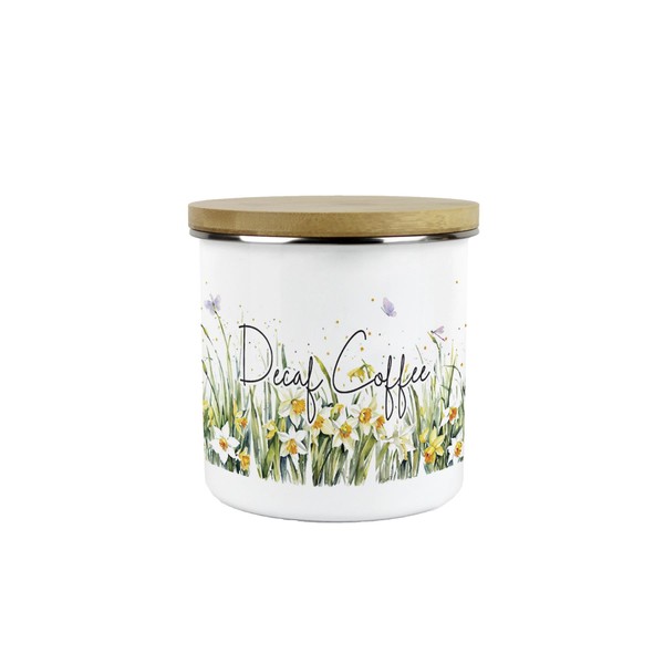 - With a stunning daffodil print, the delicate design of this enamel canister focuses on the dainty details, with butterflies and dragonflies fluttering amongst the flowers in the fresh, spring air. Perfect for all your decaf coffee storage needs!