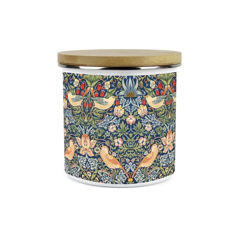 - This artistic kitchen storage canister is an unusual yet timeless gift for art lovers! Stylised on the works of famous designer William Morris, featuring a navy blue bird print surrounded by foliage & fruits. Perfect for all your kitchen storage needs!