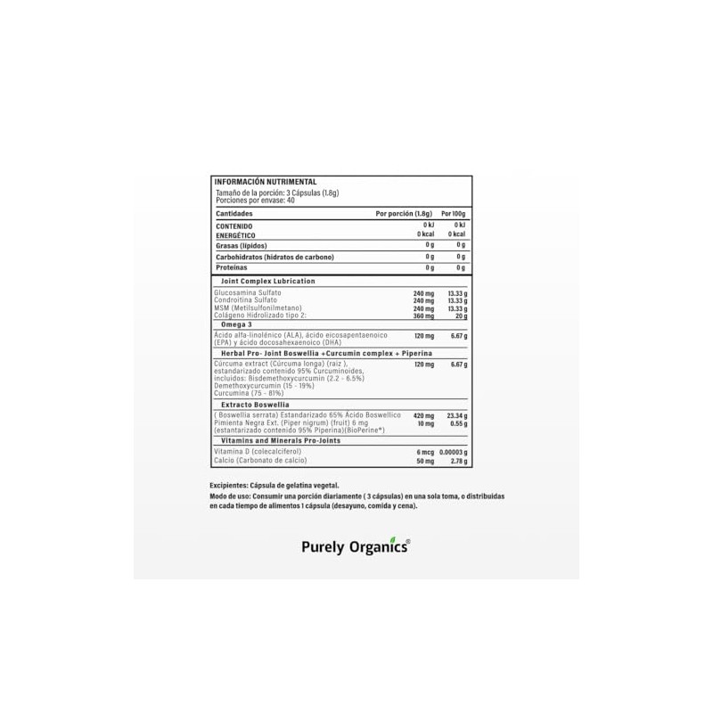 Acerca de este artículo FÓRMULA: Contiene una combinación avanzada de glucosamina, condroitina, MSM y colágeno hidrolizado, junto con omega 3, cúrcuma, vitamina D, calcio y pimienta negra. Esta mezcla está diseñada para apoyar el mantenimiento de las articulaciones y promover el confort articular a lo largo del tiempo. APORTE: Puede contribuir a la movilidad y flexibilidad articular, apoyar la salud ósea y brindar protección frente al desgaste asociado con la actividad física diaria. La cúrcuma y la pimienta negra complementan la fórmula con su aporte antioxidante y su posible efecto sinérgico. En Purely Organics seleccionamos cada ingrediente por su pureza y origen, asegurando un suplemento elaborado bajo altos estándares de calidad. MODO DE USO: Se recomienda tomar 3 cápsulas diarias, ajustado a tus necesidades y objetivos personales. Para obtener beneficios sostenidos, se recomienda su uso regular como parte de una rutina enfocada en el bienestar articular. No exceder la dosis recomendada. ESTE PRODUCTO NO ES UN MEDICAMENTO. EL CONSUMO DE ESTE PRODUCTO ES RESPONSABILIDAD DE QUIEN LO USA Y QUIEN LO RECOMIENDA. ¡SIEMPRE ES RECOMENDABLE CONSULTAR UN MÉDICO O UN ESPECIALISTA EN EL ÁMBITO!