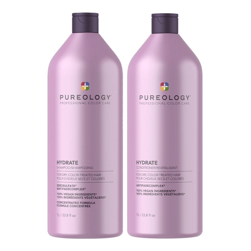The Pureology Hydrate 1L Shampoo and Conditioner Bundle includes a sulfate-free shampoo and conditioner that provide superior replenishment, touchable softness, and extraordinary color protection. The Pureology Hydrate Shampoo 1L is a gentle and moisturizing sulfate-free shampoo that can be used for color-treated or dry hair. Its advanced hydrating "Micro-Emulsion Technology" deeply hydrates to revitalize dry hair and enhance color radiance, while Jojoba, green tea, and sage condition. Multi-weight proteins of soy, oat, and wheat help strengthen, rebuild, and repair, and Pureology's exclusive AntiFade® Complex protects color vibrancy. A final touch of the signature aromatherapy blend of ylang-ylang, bergamot, and patchouli scents the collection. The Pureology Hydrate Conditioner 1L is an intensely moisturizing conditioner that nourishes strands and prevents breakage. It penetrates the shaft and leaves locks soft and luscious. What are the benefits and features of Pureology Hydrate 1L Shampoo and Conditioner Bundle? Provides superior replenishment, touchable softness, and extraordinary color protection. Advanced hydrating "Micro-Emulsion Technology" deeply hydrates to revitalize dry hair and enhance color radiance. Jojoba, green tea, and sage condition. Multi-weight proteins of soy, oat, and wheat help strengthen, rebuild, and repair. Pureology's exclusive AntiFade® Complex protects color vibrancy. Signature aromatherapy blend of ylang-ylang, bergamot, and patchouli scents the collection. Who is Pureology Hydrate 1L Shampoo and Conditioner Bundle for? This bundle is perfect for those who want to deeply hydrate and revitalize their dry hair while enhancing color radiance and protecting color vibrancy.