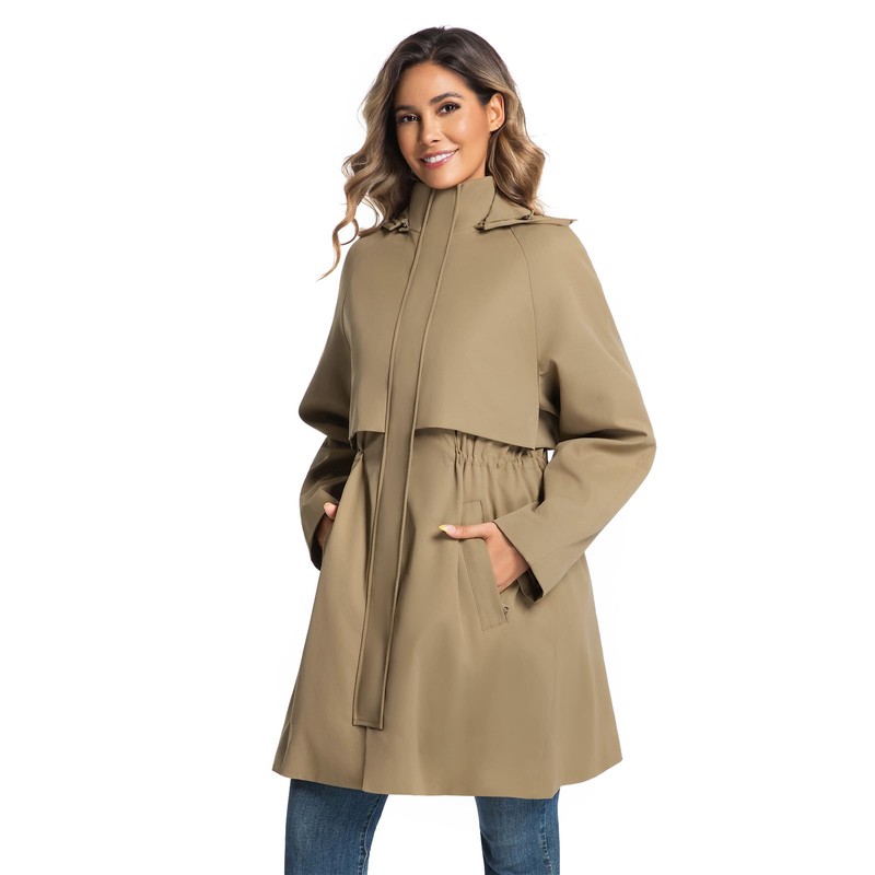 - Waterproof: This stylish women's raincoat is made from waterproof fabric and features a rain-blocking brim with a detachable hood. Designed to handle sudden spring or fall showers, it keeps you comfortably dry
