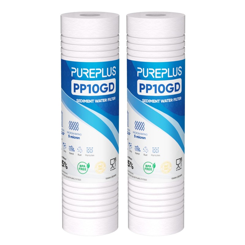 PUREPLUS 5 Micron 10" x 2.5" Whole House Sediment Home Water Filter, Grooved Sediment Replacement Cartridge for Any 10 inch RO Unit,AO-WH-PREV-R2, Aqua-Pure AP110, Aquaboon AB-SGR5M, GE GXWH20S, 2Pack
