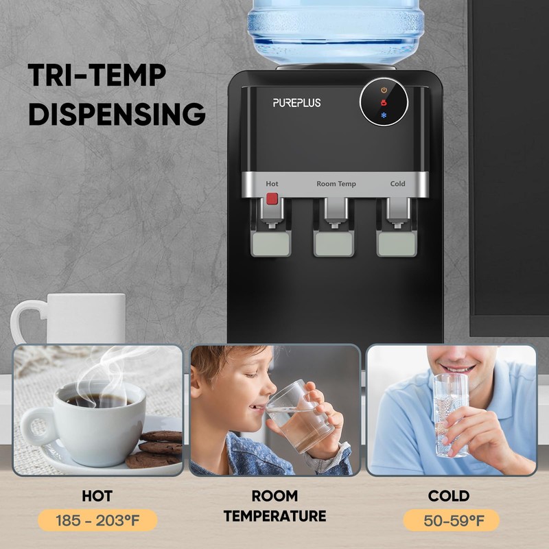 PUREPLUS Top Loading Water Cooler Dispenser, Countertop Water Cooler for 3 or 5 Gallon Bottles, Hot & Cold Water, 3 Temperature Settings, Child Safety Lock, Removable Drip Tray for Home, Office