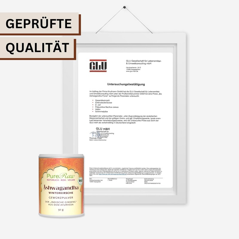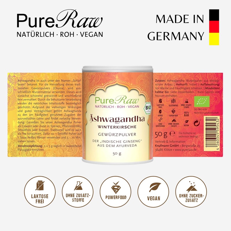 - ASHWAGANDHA-PULVER BIO: Reines Wurzel-Pulver, schonend getrocknet und fein vermahlen. Aufgrund der vielseitigen Wirkungen und guten Vertr?glichkeit geh?rt Ashwagandha zu den am H?ufigsten genutzten Zugaben der ayurvedischen Ern?hrungslehre und findet als universales Superfood vielseitige Verwendung. In Indien kommt Ashwagandha sogar eine vergleichbare Bedeutung zu wie dem Ginseng in China.