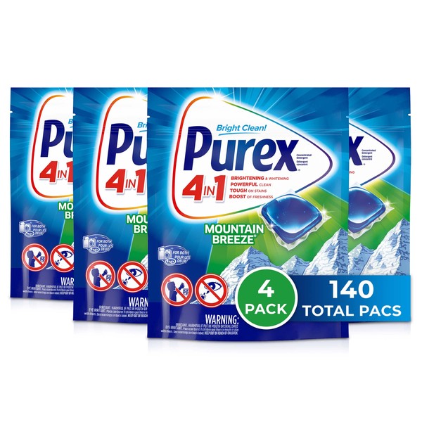 - This package includes 4 pouches of 35 Purex 4 in 1 laundry detergent pacs in Mountain Breeze scent, enough for 140 loads
