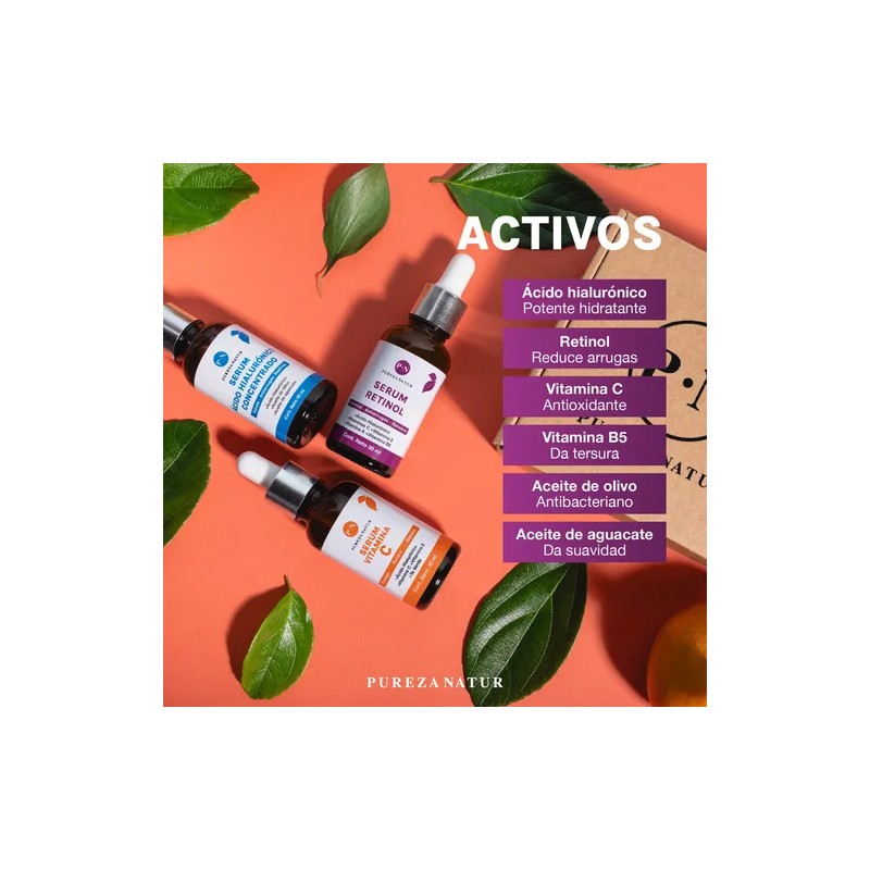 PUREZA NATUR Kit Serum facial Acido Hialurónico, Vitamina C y Retinol anti edad | Paquete completo de serum para el cuidado de la piel, hidratación y rejuvenecimiento con 3 sueros skincare