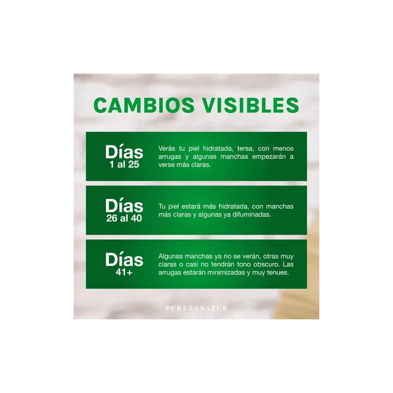 CONTENIDO: Cada uno de los sueros ANTI-MANCHAS INTENSIVO PUREZA NATUR crea un efecto aclarante y desmanchante. Cada frasco contiene 50 ml.