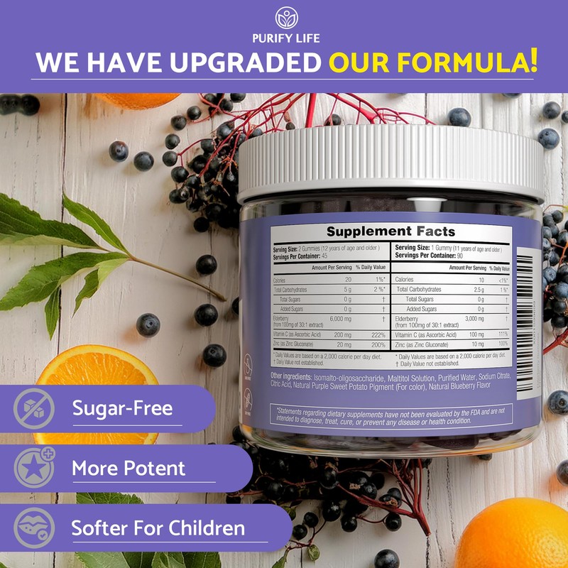 [No Sugar, No Problem] – Stay on top of your health with Purify Life's upgraded blueberry-flavored elderberry gummies, which are completely sugar-free. Ideal for those mindful of their sugar intake while still wanting to maintain their wellness.