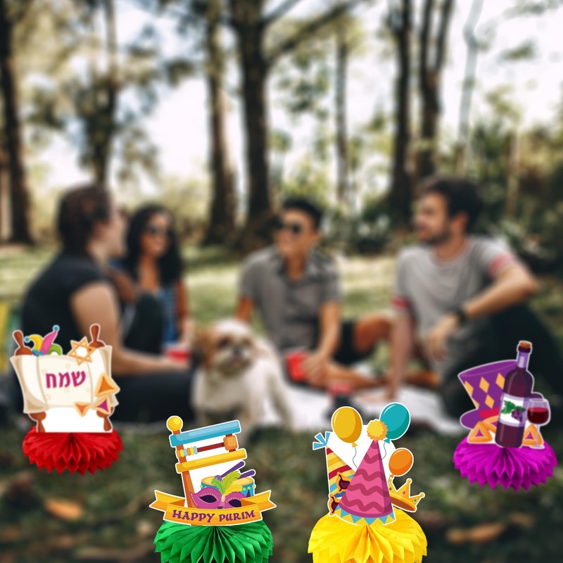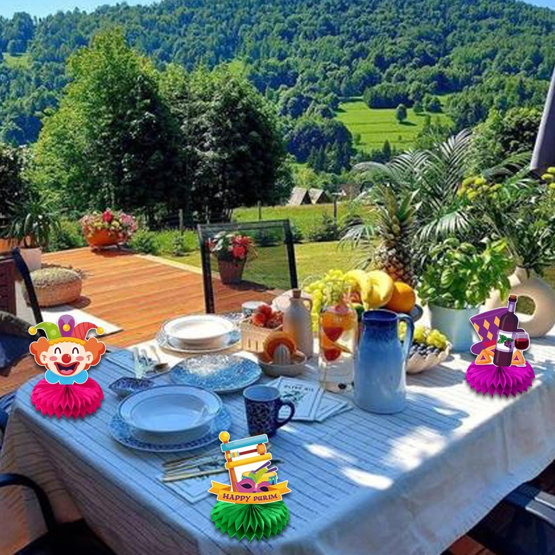 - Package Includes: Our Purim honeycomb centerpiece include 6 packs Happy Purim honeycomb table toppers with double-sided printed of vibrant colorful patterns, which will add an extra touch to your Purim carnival party and celebration. This honeycomb toppers are packaged with 6 pieces. Each cards sizes around 6”x 7.2” (L x H).