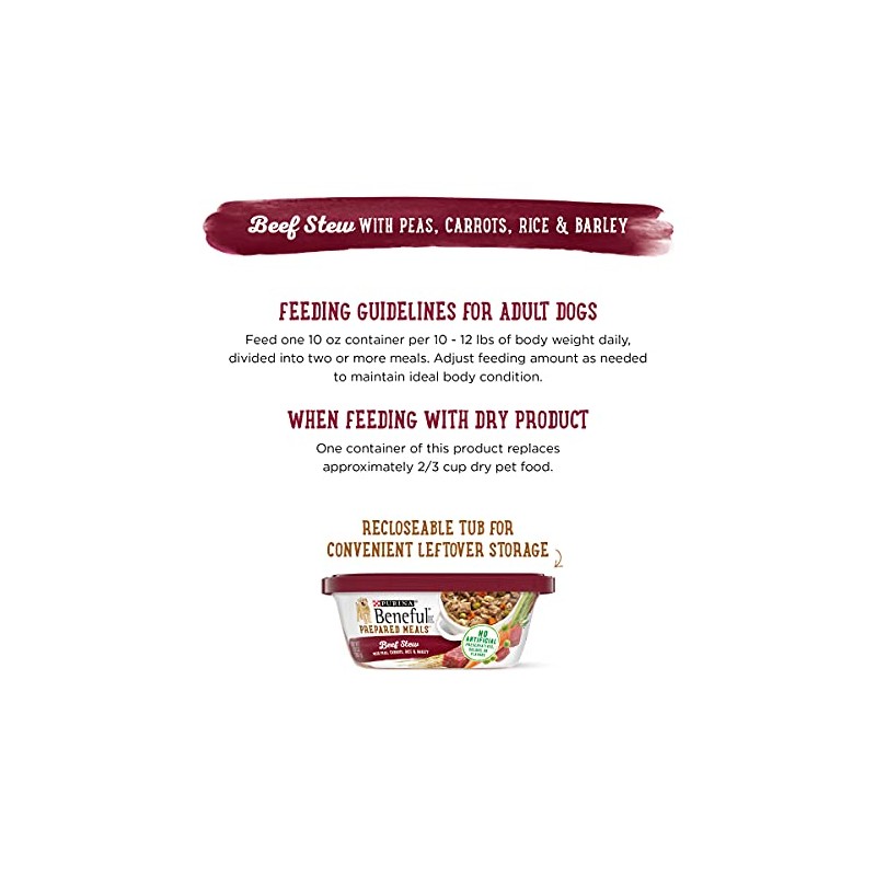 Feed your dog a meaty and delicious meal with Purina Beneful Prepared Meals Beef Stew wet dog food. Watch him devour every bite of this savory, high-quality dog food with tender, meaty chunks, wholesome grains, veggies and flavorful dog food gravy. This thoughtfully crafted recipe is made with real beef to provide a source of high-quality protein that supports his strong muscles. With a blend of real veggies you can see, including peas and carrots, rice and barley, your pal gets a delicious recipe that offers him the nutrients he needs daily. This Purina Beneful wet dog food entree supplies 100 percent complete and balanced nutrition for adult dogs. Your dog is sure to love sinking his teeth into this prepared gravy dog food that contains no artificial colors, flavors or preservatives, and you can feel good about providing him with a mouthwatering meal that contains 23 essential vitamins and minerals. We package each wet dog food recipe in a reclosable tub to make it easy to store leftovers.