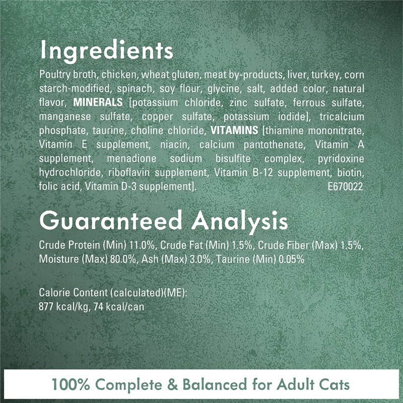 - 100 percent complete and balanced nutrition for adult cats. Tender white meat chicken is a delectable way to add texture to your cat's daily meals