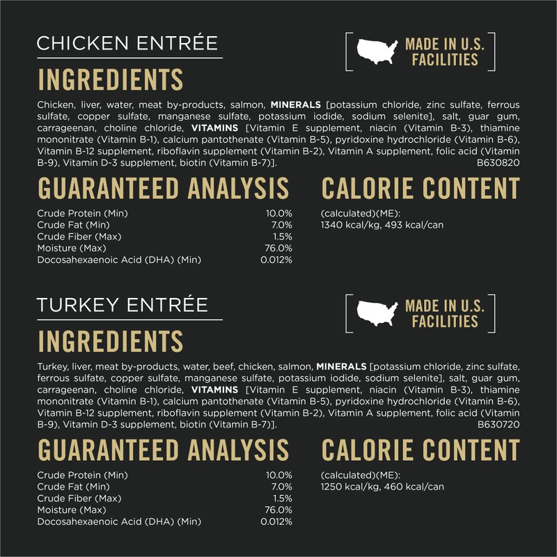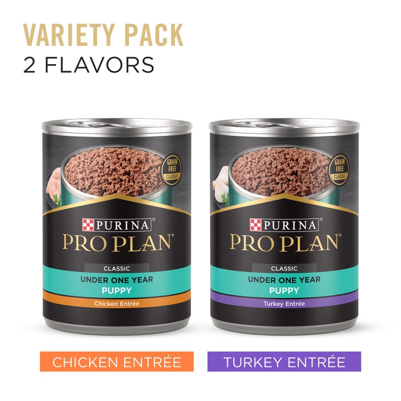- Twelve (12) 13 oz. Cans - Purina Pro Plan Development Grain Free Chicken Entree and Grain Free Turkey Entree Wet Puppy Food Variety Pack