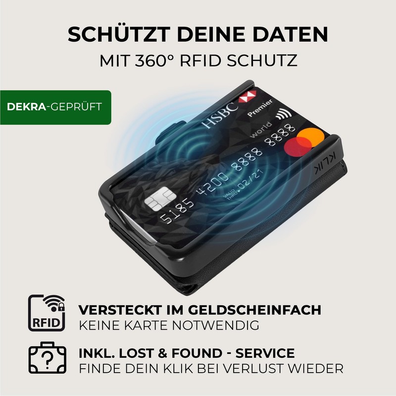 - RFID protection with Lost & Found service – The slim wallet for men has an integrated RFID blocker (Dekra tested) to protect against data theft. Each men's smart wallet also has a coding and can be found in the event of loss.