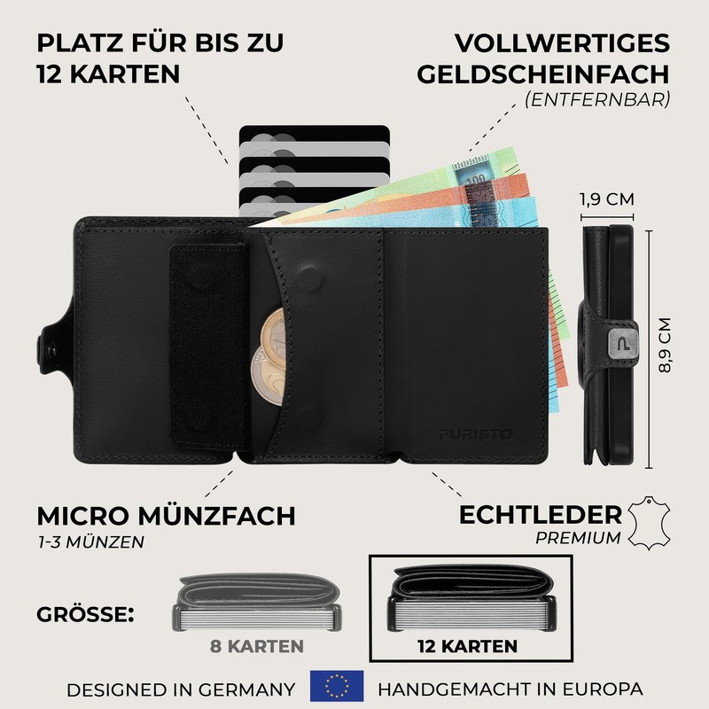 - Quick access to notes and coins – with full-fledged note compartment made of premium genuine leather. No more cumbersome folding. The small coin compartment does not take up card space and opens easily without coins falling out.