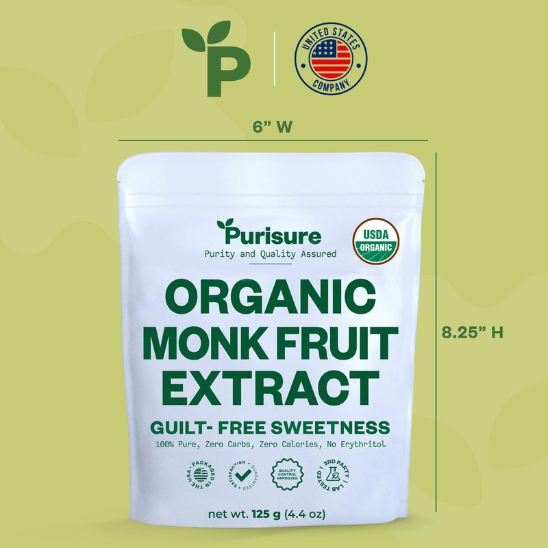 Purisure Monk Fruit Extract 125g (4.41oz) 400 Servings, 100% Pure No Fillers, Sugar-Free Natural Sweetener, Zero-Calorie Zero-Carb Sugar Substitute, Perfect for Low-Sugar, Low-Carb, Keto, Paleo Diets