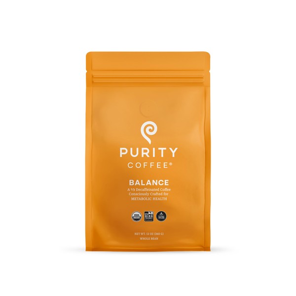 Purity Coffee BALANCE 2/3 Decaf Medium Roast Whole Bean Coffee (12oz Bag) - Specialty-Grade Mountain Water Processed Decaf + Regular Arabica Blend- USDA Certified Organic Decaffeinated - Third Party Tested for Mold, Mycotoxins, Pesticide Residue