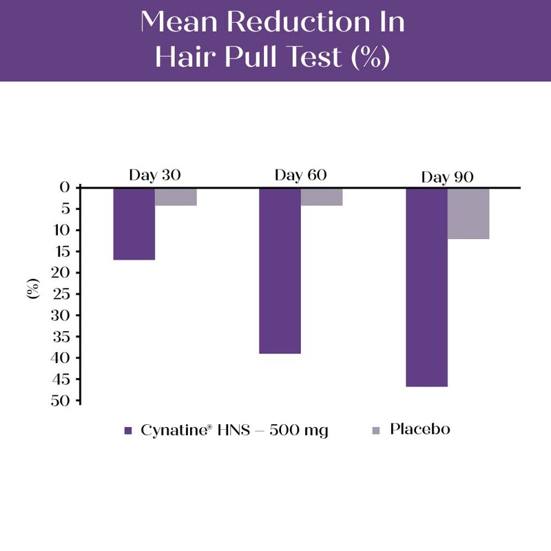THE INNOVATIVE WAY TO GROW STRONGER, MORE BEAUTIFUL HAIR WITH GREATER LUSTER AND SHINEThe MyKeratin breakthrough comes in the form of Cynatine HNS, an innovative keratin molecule that is more absorbable than ordinary keratin. The patented process used to create Cynatine HNS delivers key keratin protein into your body, where it is used by your hair to promote strength and luster.*A groundbreaking study1 on the exact 500 mg dose of Cynatine HNS in MyKeratin produced some amazing results:Stronger HairHair strength was measured using a gentle "pull test" and the exact number of hairs lost were counted. Subjects in the placebo group saw no reduction in the number of hairs lost at Day 30 and Day 60 (and only a slight reduction at Day 90) while subjects taking the active ingredient in MyKeratin experienced: 16.9% reduction in hair loss at Day 30 38.9% reduction in hair loss at Day 60 46.6% reduction in hair loss at Day 90 5.9% increase in hair tensile strength by Day 90Brighter HairWhile the Cynatine HNS subjects were enjoying stronger hair and less hair loss from normal washing and brushing, they also saw a second big hair benefit: more hair luster and shine! Hair brightness was determined by a licensed dermatologist, who assigned a score of 1, 2, or 3 as a measurement of brightness and luster. The results showed: 17.6% improvement by Day 30 35.3% improvement by Day 60 47.1% improvement by Day 90In fact, 87.5% of the people who took the active ingredient in MyKeratin reported loving their brighter, shinier hair (as opposed to only 16.7% in the placebo group).