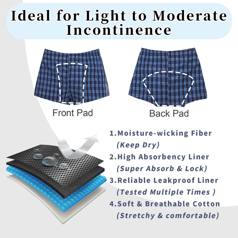 - Advanced Leakproof Design ¨C Men's incontinence underwear features a four-layer hanging absorption system that delivers complete protection from front to back. Relaxed elastic waistband that reduces abdominal pressure, look like regular boxer briefs