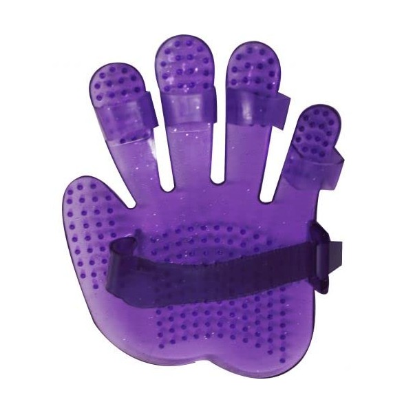 Showman Adjustable Rubber Curry Mit. This mit features flexible rubber with glitter that forms to the shape of your hand. Fingers and palm feature rubber curry's. Adjustable hand strap. Measures 7" long x 5" wide. Purple