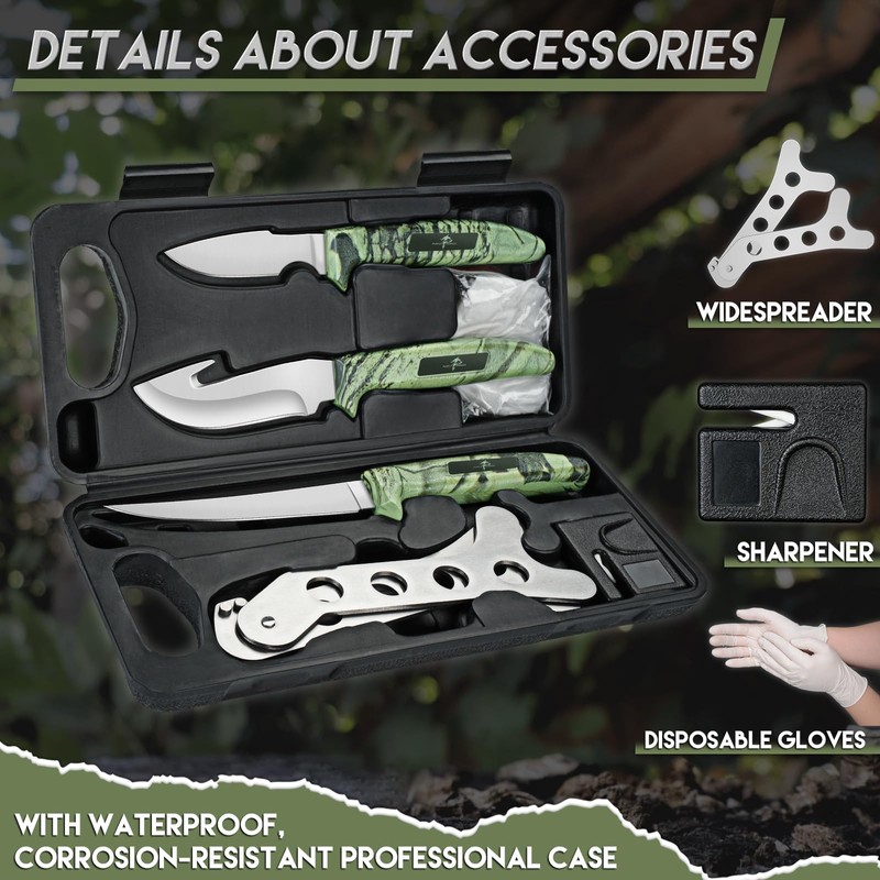 - HUNTING ACCESSORIES - To make short work of gutting, skinning, and processing an animal such as deer, buck, and hog, the field dressing kit includes an 8.1" caping knife, 8.7" hunting knife with gut hook, 9.6" boning/fillet knife, ribcage spreader, gloves, and hard-side case. This comprehensive hunting kit is perfect for all your deer hunting gear needs.