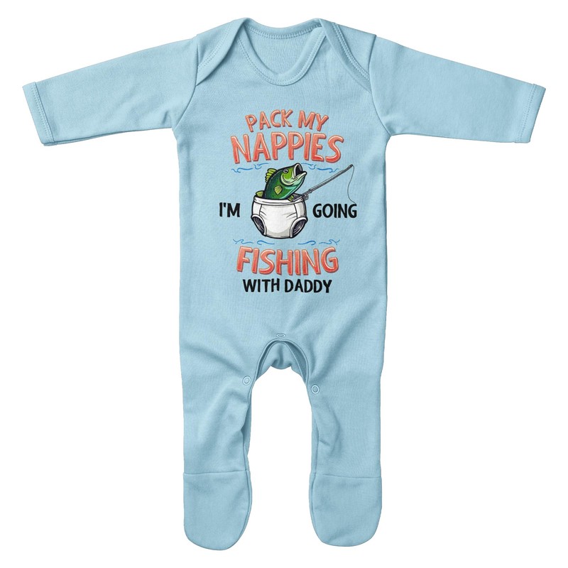 - This funny baby romper for new dad features the playful 'Pack My Nappies I'm Going Fishing With Daddy' design, perfect for Father?s Day, birthdays or a light-hearted newborn gift. It?s ideal for dads who love fishing and spending time with their little one.