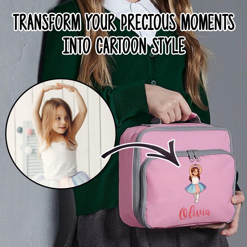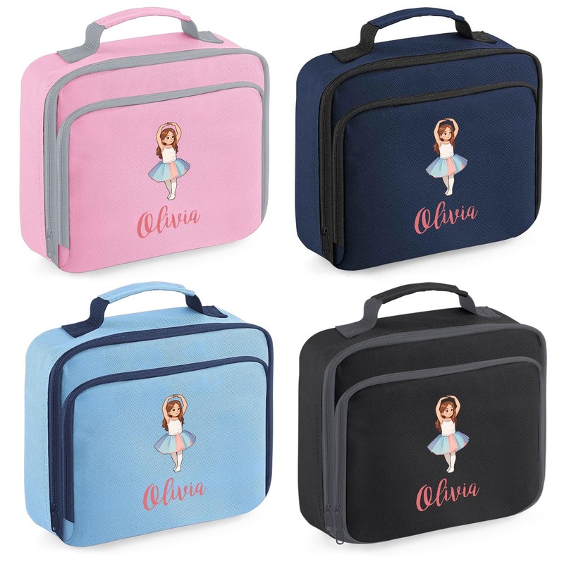 • This personalised ballerina image girls lunch bag features a unique design made from a custom photo with a personalised name. It’s perfect for back to school or nursery, providing young girls with a fun and practical way to carry their lunch every day.