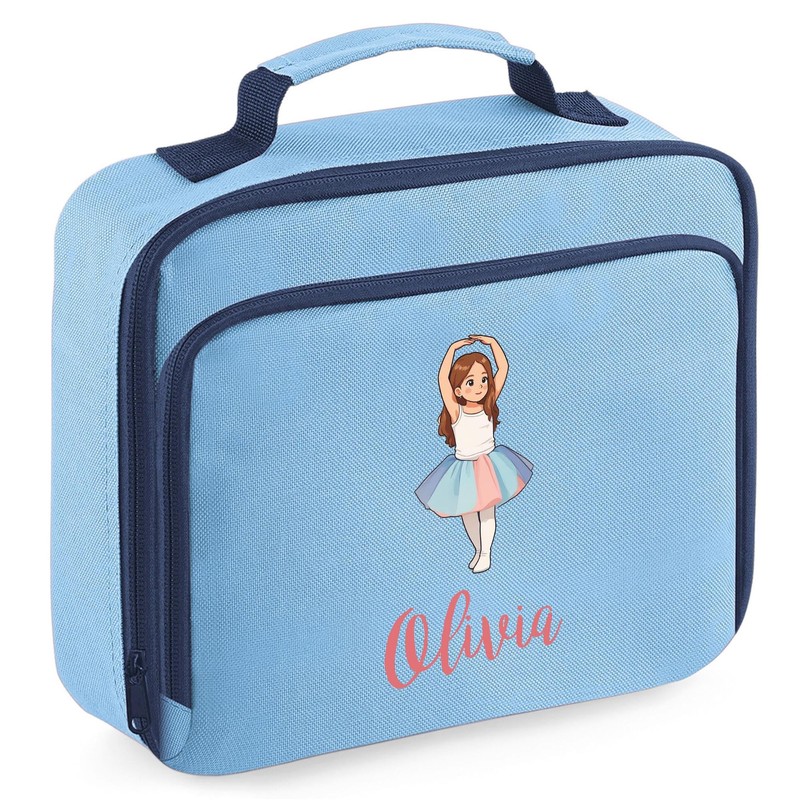 Purple Print House Personalised Ballerina Image Girls Lunch Bag from Custom Photo Infants Back to School Nursery Lunchbox with Kids Name, 24cm x 20cm x 8cm, Sky Blue