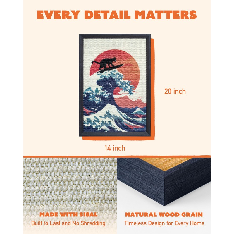 PURRDEE Decorative Cat Wall Scratcher, 14x20 Artwork Inspired Sisal Cat Scratcher with Stylish Wooden Frame, Removable Hook-and-Loop Mounting Strip, Unique & Functional Cat Gift (The Great Wave)