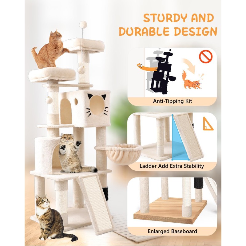 - STRUDY AND STABLE CONSTRUCTION: Designed by a professional structural engineer to ensure stability and safety. Enlarged baseboard and heavy-duty posts prevent wobbling or tipping, even during energetic play. Strengthened with the reinforced joining board system and scratching ramp for added durability. Includes an anti-toppling kit to securely fasten the tower to your wall, always keeping your cats safe.