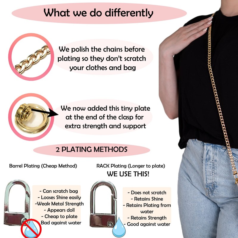 • HIGH QUALITY IRON METAL: Providing high polished purse chain quality to out stand rainy and hot scorching days keeping your fashion in tact without ever worrying about rust or damage for 2-3years. We keep your fashion safety on lock!
