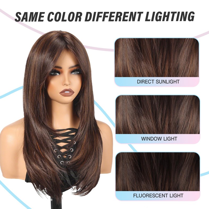 purshine Long Black Mix Brown Wig with Bangs for Women, Heat Resistant Synthetic Fiber Wig, 23 Inch Layered Middle Part Wig, Naturally Realistic Appearance, Suitable for Daily Party Use